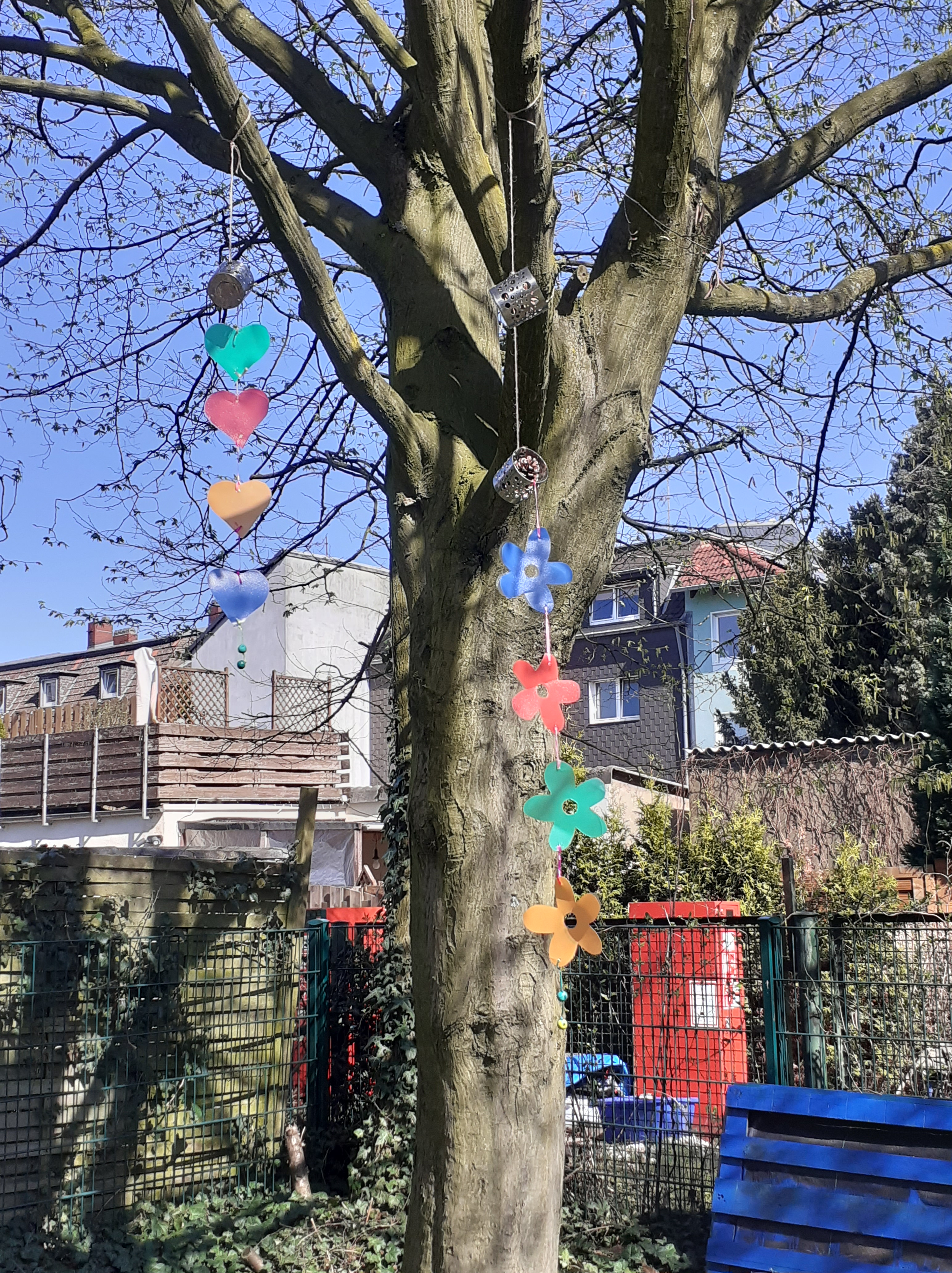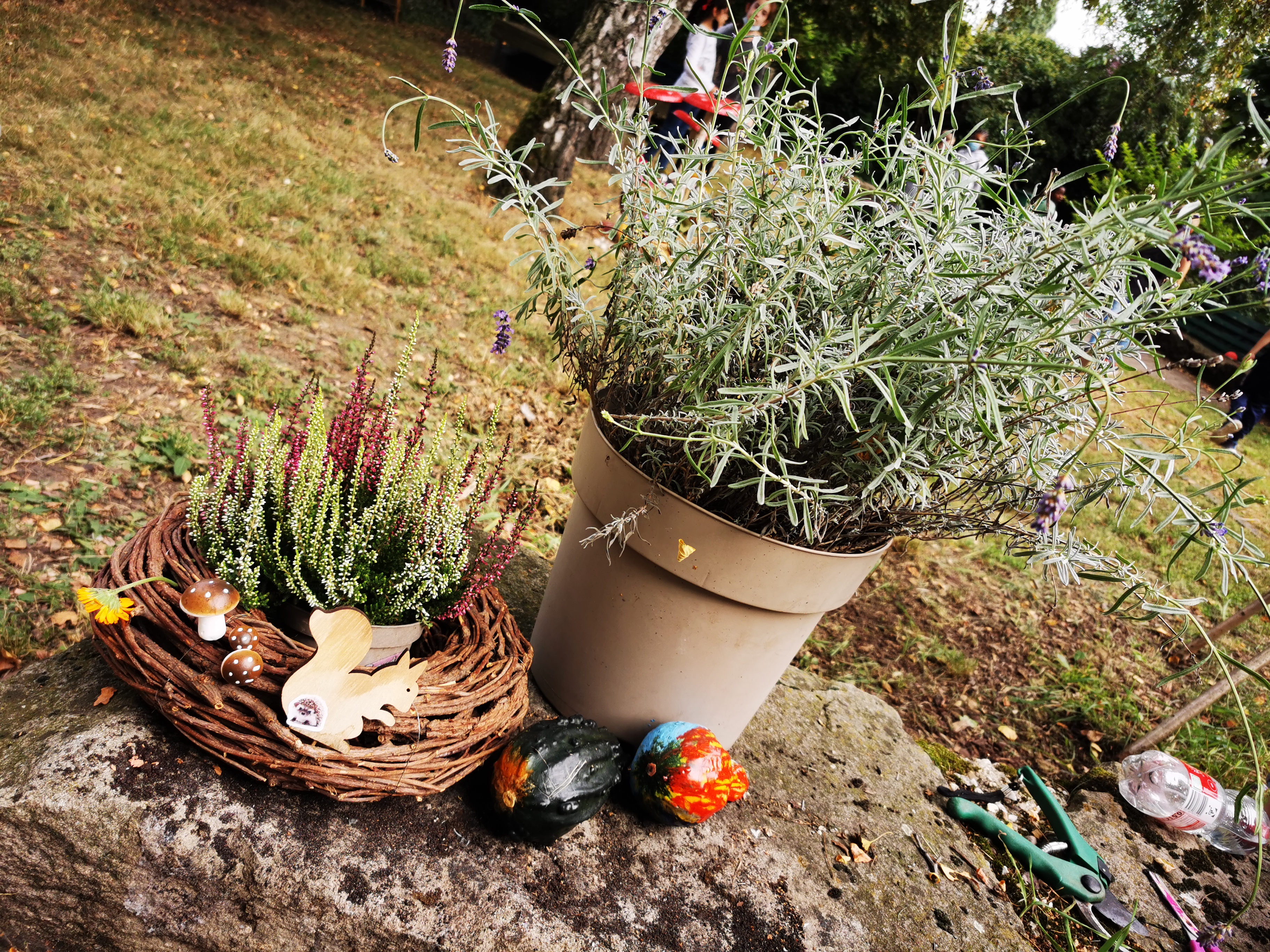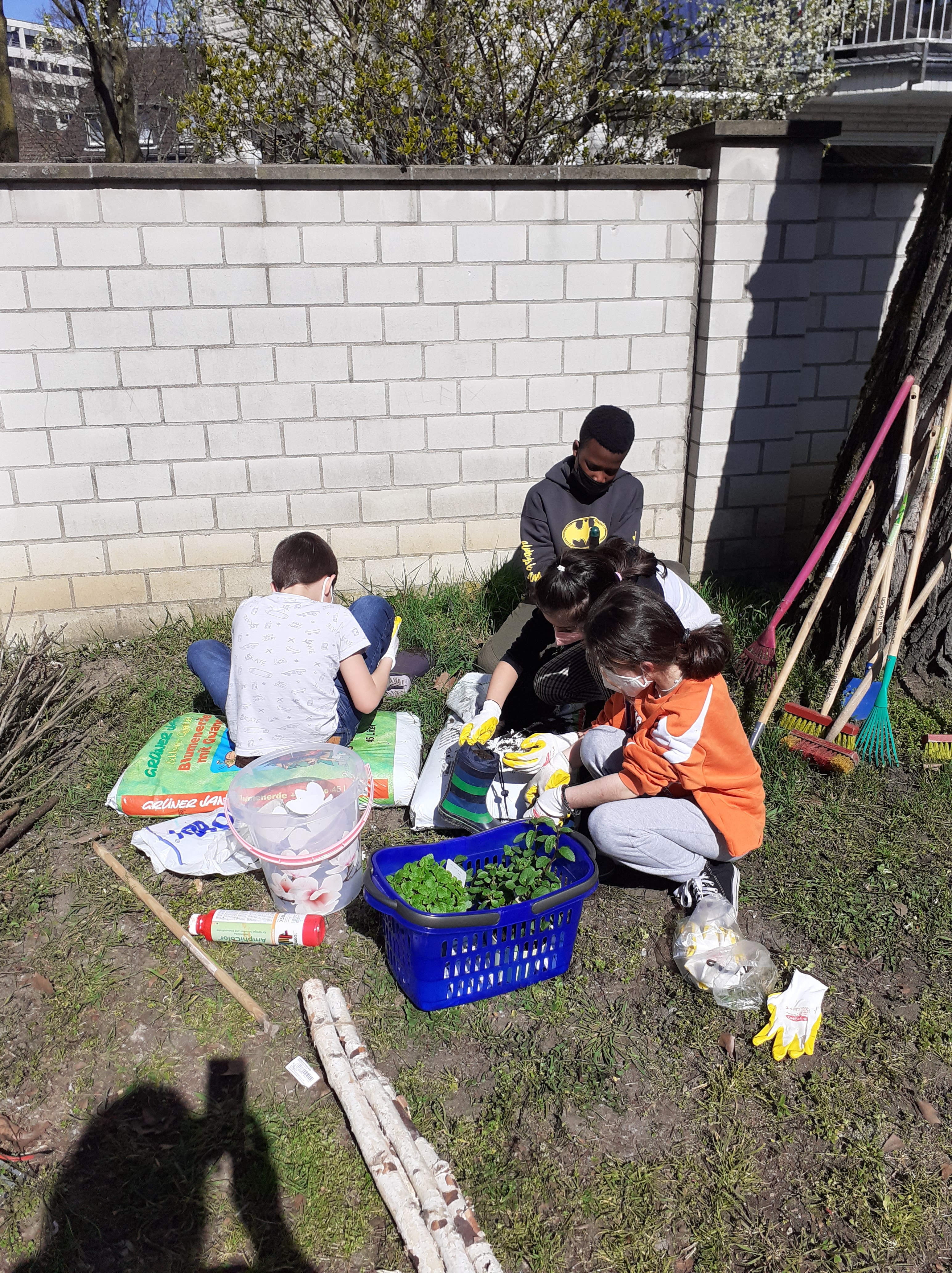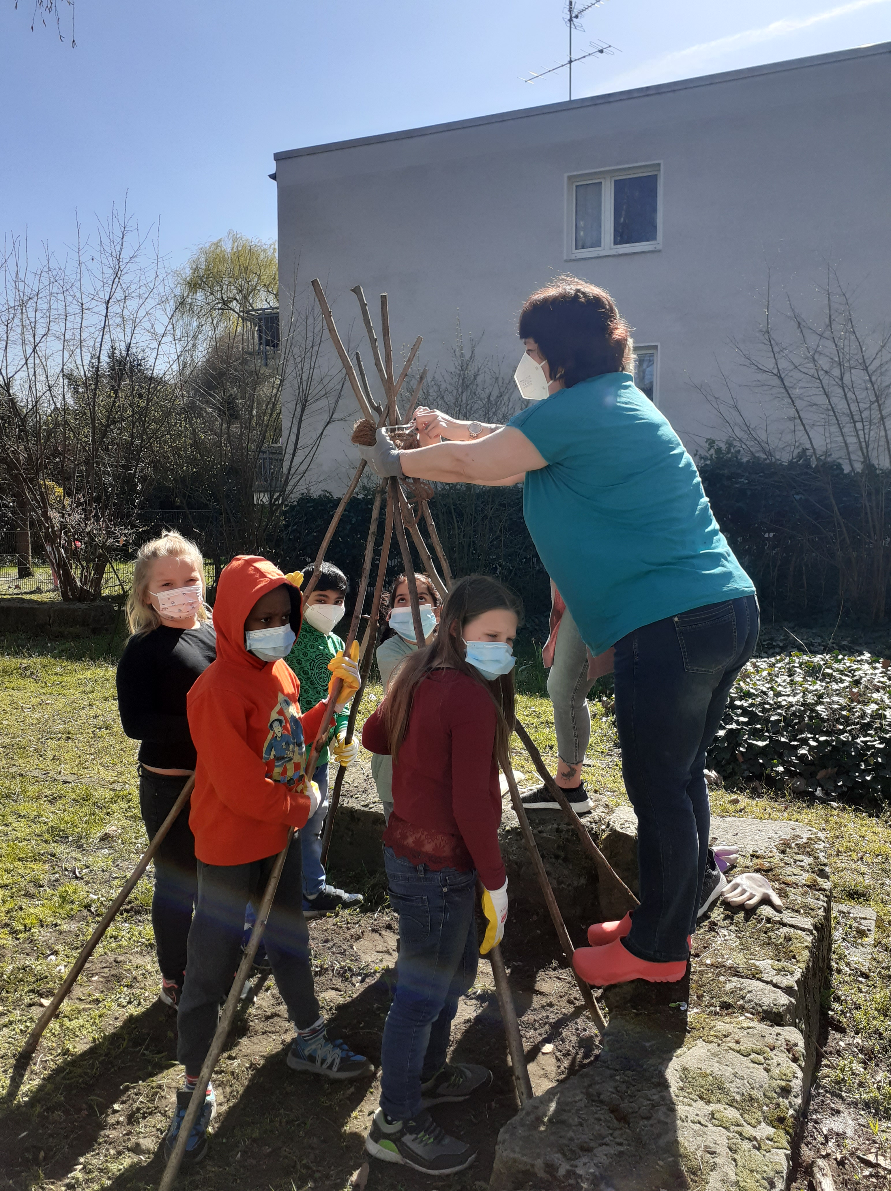 Dies ist unser Schulgarten. Hier lernen wir viel über die Natur. Wir können selber Blumen pflanzen, und bei schönem Wetter haben wir hier sogar manchmal Unterricht.